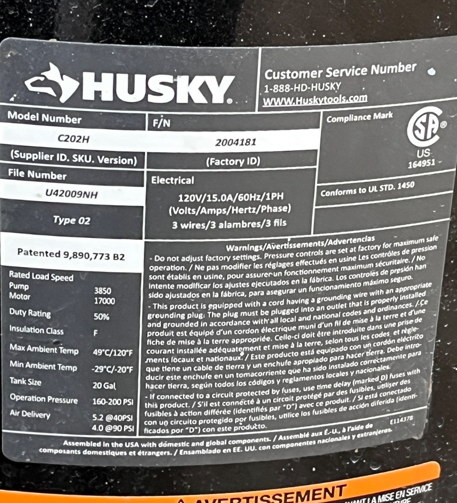 Husky 20 Gallon Portable Electric Air Compressor C202H